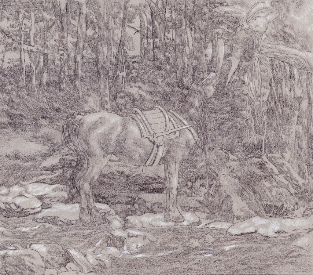 I liked my prophetic interpretation of my dream, and this is mostly where my thinking rested until late summer of 2023, when the dream resurfaced with a lot of energy that felt somehow new. I couldn’t decipher what this energy was telling me, but the images of the dream now made me feel like I was inhabiting a fairy tale, albeit an unfinished fairy tale. What happens next to this little girl stranded atop the giant horse? When I related the dream to a Jungian psychologist I stressed the feeling of being in a fairy tale; she seemed as fascinated by the dream story as I have always been and asked the same question of what my little girl self does next. “Maybe you should try creating a fairy tale out of this dream,” she said. Her tone was so enthusiastic and playful, as though my writing a fairy tale was entirely possible.