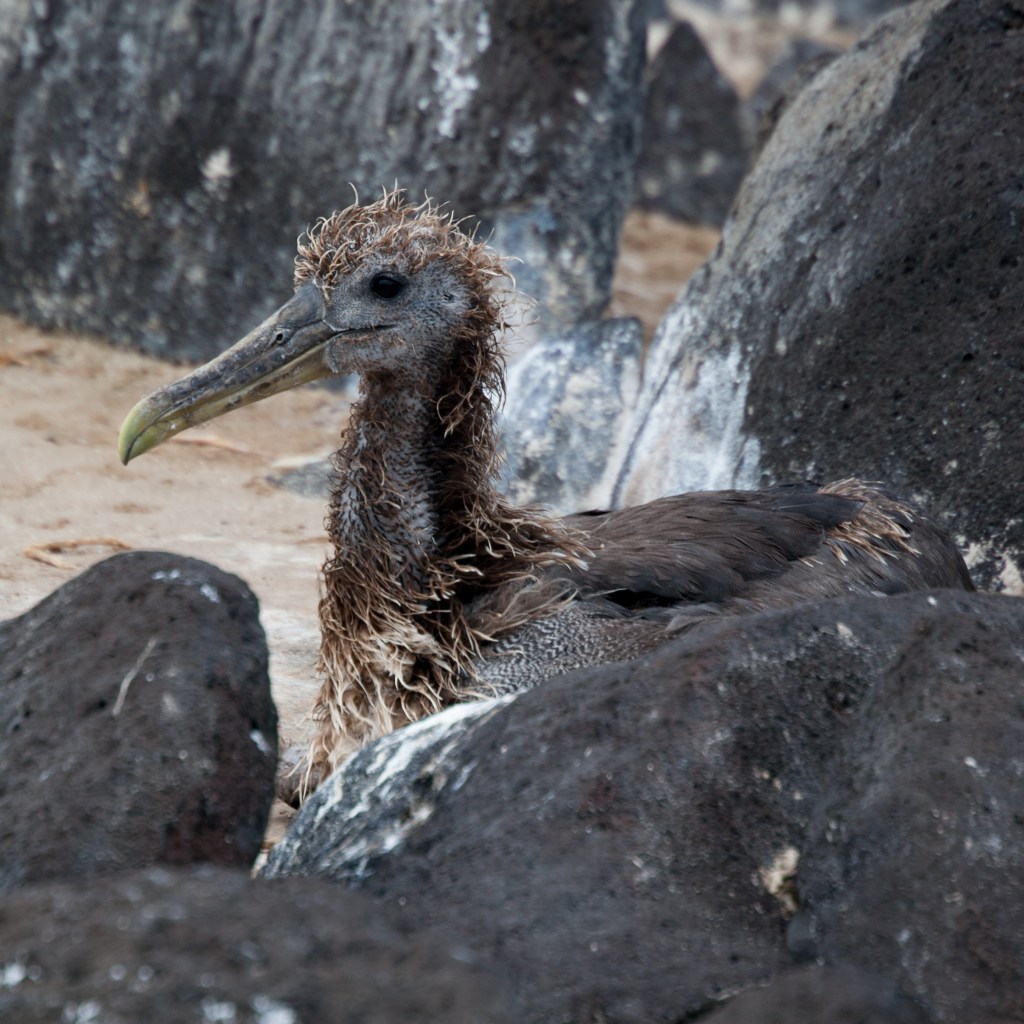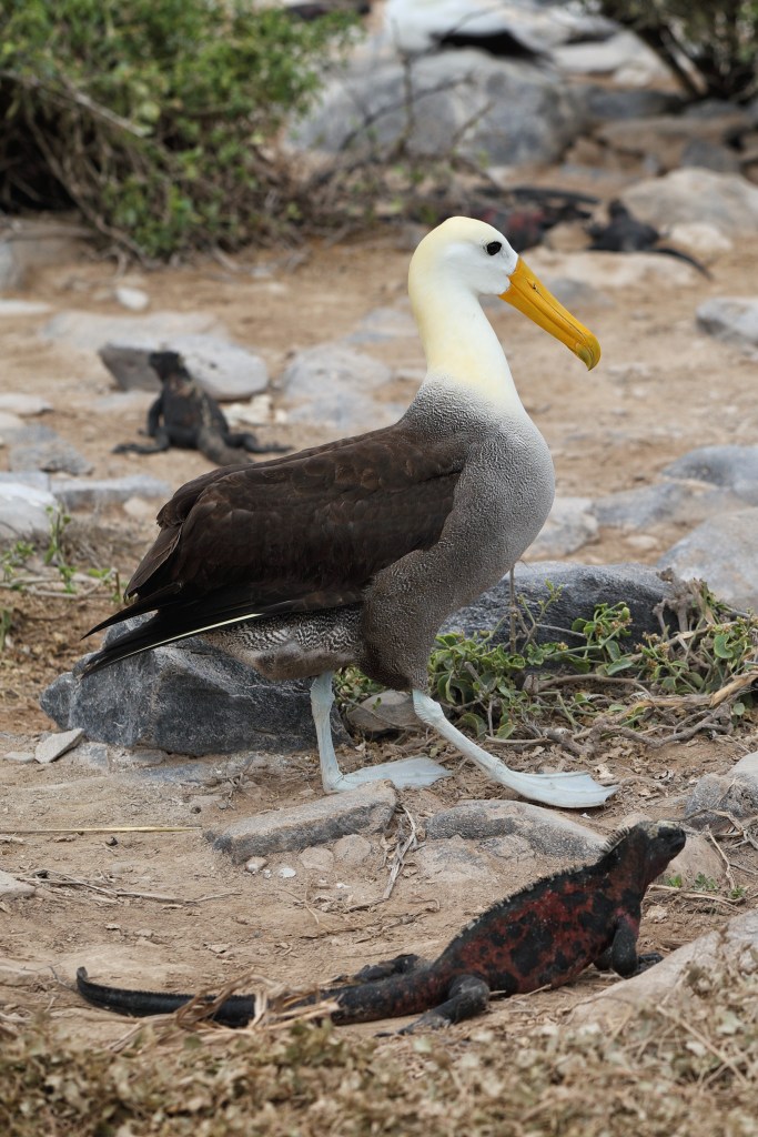 The Galapagos Albatrosses ( which you humans sometimes refer to as Waved Albatrosses) are the only one of Earth’s 22 albatross species to live at the equator. They are smaller than we Wanderers, with wing spans of ~8 feet compared to our ~12 feet. The Galapagos birds are about 31-35 inches from beak to tail, and have lovely bright yellow bills, in contrast to our pale pink bills.
