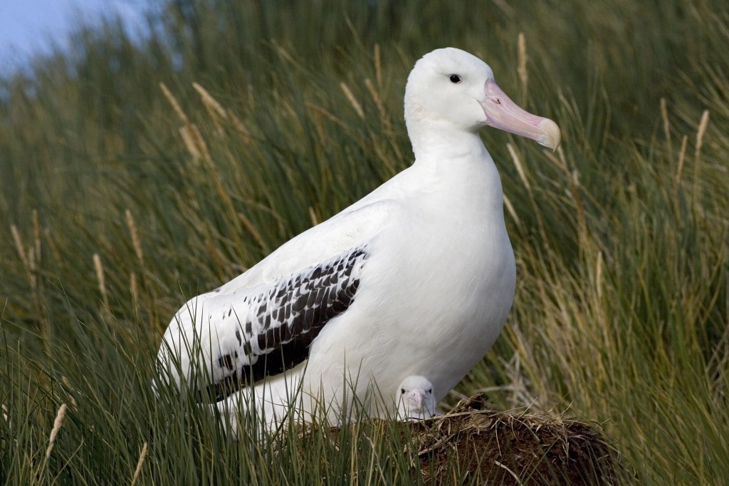 Today I want to introduce you to some of my albatross cousins who live at the equator, but first … My pride demands that I share an update from here on Bird Island in the south Atlantic. Ilupa and I have been working hard to keep our new chick Lukarri well fed and safe. Lukarri was very camera shy at first—you can barely see her peeking out from under Ilupa—but now she is a little more brave. She is also old enough that Ilupa and I have begun telling her some of the stories of our ancestor Tiyua the Wanderer. Lukarri is as enthralled by these tales as we were when we were young chicks.
