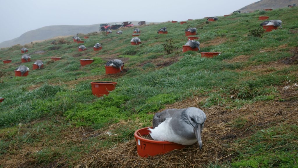 Until very recently, the entire global population of Chatham albatrosses (~5,300 adult breeding pairs) nested on one tiny rock islet known as the pyramid, about 50km south of the Chatham Islands. Near the top of the pyramid is a small cave in which some of the birds build their mud and grass pedestal nests, but most pairs nest on the slopes of this rock crag. Over time, however, storms have eroded much of the grass and mud the birds need for nest building. This problem has accelerated as climate change produces more powerful storms, so biologists with the Taiko Trust have installed artificial nest pedestals on the pyramid, which the birds do use.